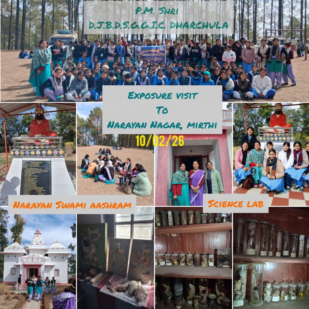 As part of the ongoing commitment to experiential learning under the PM SHRI scheme, students from P.M. SHRI D.J.B.D.S. Government Girls Inter College, Dharchula, participated in an enriching exposure visit to Narayan Nagar (Mirthi) in February 2026. The visit to the historic Narayan Swami Ashram provided the students with a unique opportunity to connect with their regional heritage and learn about the socio-cultural significance of the Ashram. By moving beyond traditional classroom boundaries, the tour aimed to foster holistic development and practical understanding among the young scholars. The students actively engaged with the serene environment, gaining insights into the legacy of social service and education that the Ashram represents in the Pithoragarh district.